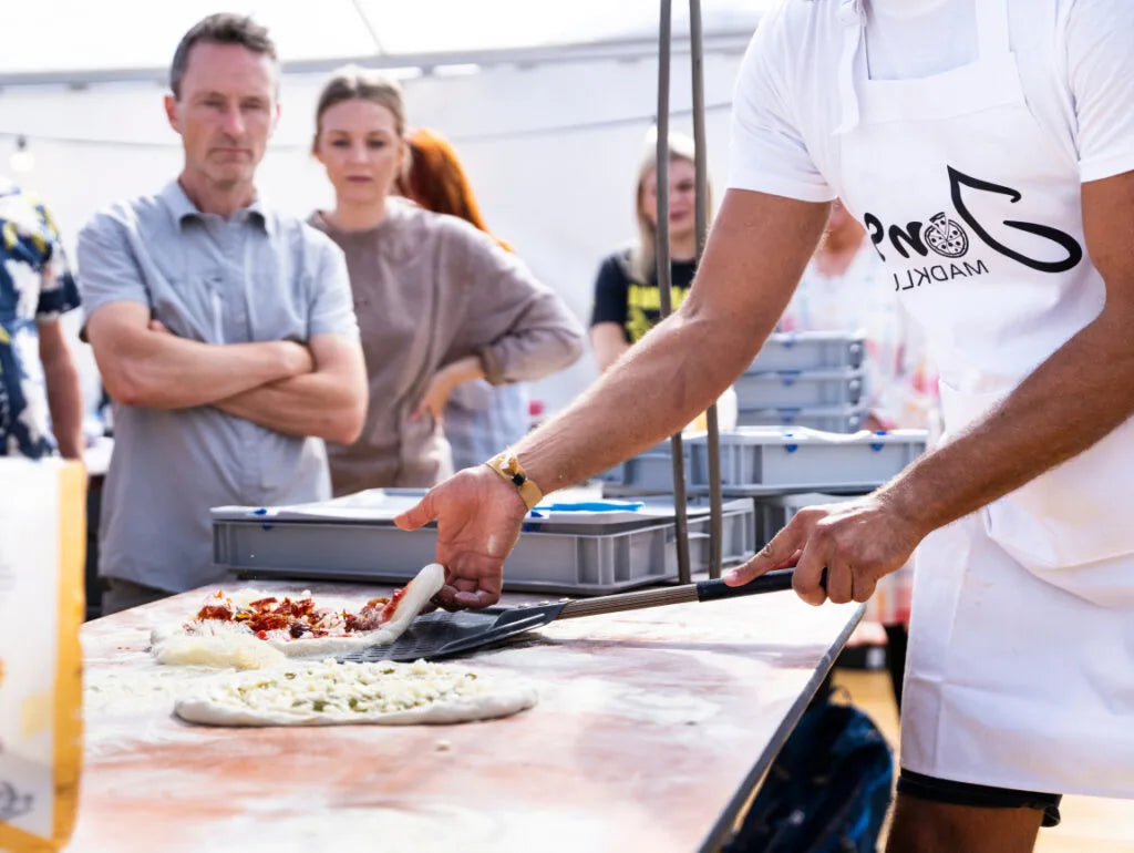 Så går vi hands-on: I former, topper og bager jeres egne pizzaer – og jeg står klar med tips, jokes og pizzapeel.